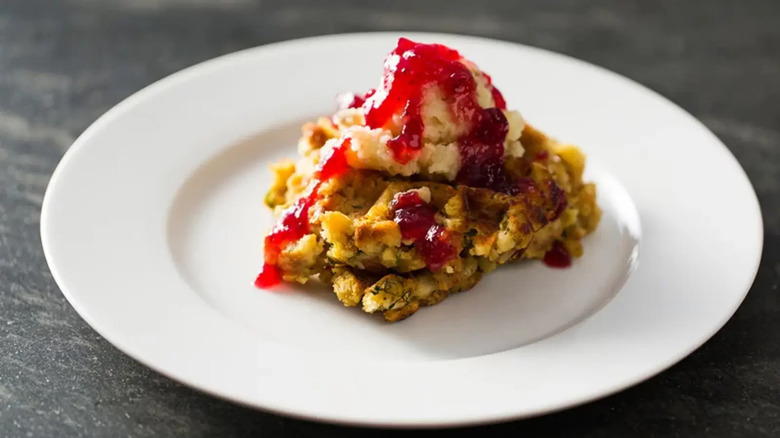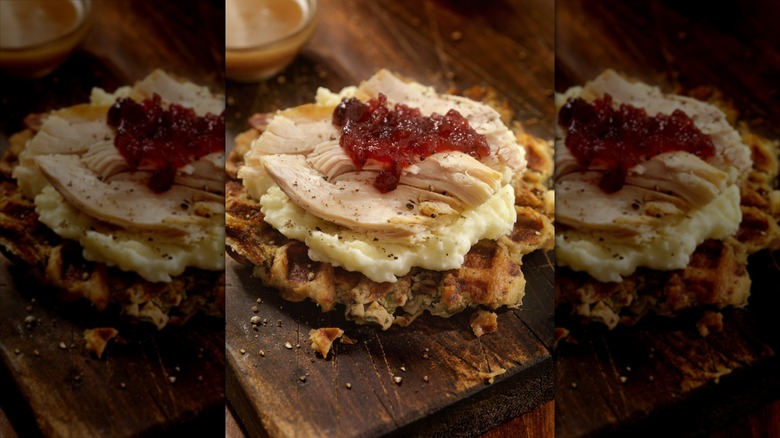 When your waffles are ready, keep it simple with butter and syrup, or serve it with sunny-side-up or over-easy eggs. The runny egg yolk will be a delicious pairing with the waffle's savory flavors. You can also make it a complete brunch by serving it alongside other leftovers like sliced turkey or ham, mashed potatoes, or spoonfuls of gravy. And if you prefer a sweeter breakfast, serve it with a dollop of cranberry sauce. Any variation is a good way to keep the festivities going and prevent good waste.