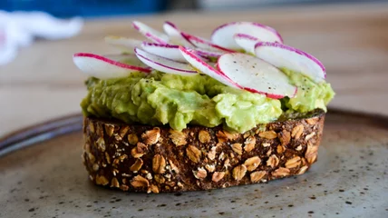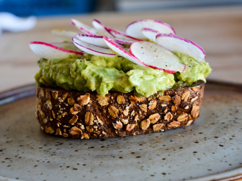 Thin slices of Weiser Family Farms radishes are piled on top of avocado mash and whole wheat bread made with hard red winter wheat, soft red spring wheat, salt and sourdough culture.