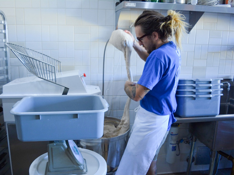 Baker Alex Phaneuf measuring out country bread dough to be made into the bakery's stunning loaves.