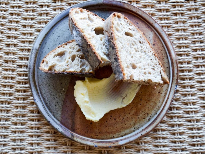 The butter is made in-house with cream from a Petaluma farm and a yogurt culture, and then it's fermented for five days and aged for another month, leaving it with a strong flavor. All that's needed now are a few slices of bread and some salt.