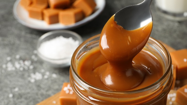 When you're ready to remove the can from the boiling water, first turn off the heat, then use the tongs again to transfer it to your sink. To rapidly cool the can off, submerge it in an ice bath. While the can may feel cool, the sauce inside might still be hot, so be careful. Use a can opener to open the lid and bask in the glory of cheater caramel sauce, easily made from any can of sweetened condensed milk. The simplicity of this technique is inversely proportional to the elaborate, gourmet flavors it produces, making it likely you'll repeat this food hack again and again.