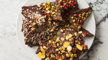 If it tastes good with chocolate, it'll taste good on bark-but here are three of our favorite combinations. Do Christmas in Hawaii with toasted coconut flakes and macadamia nuts or channel the King with peanuts, banana and bacon. Or for a sophisticated (and color-appropriate) version, decorate the top with pistachios and pomegranate seeds.