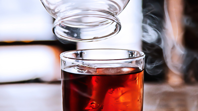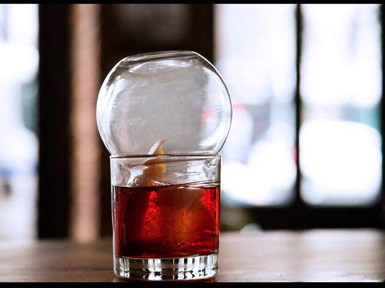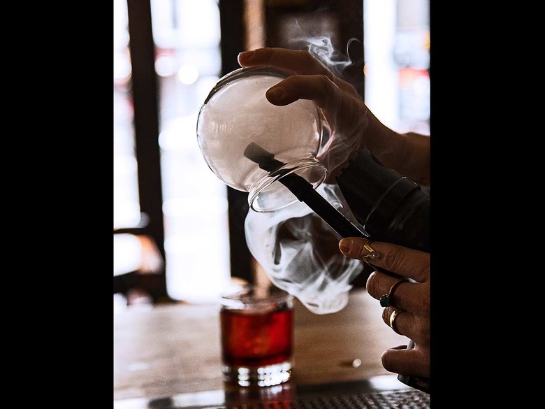 Laino fills a glass globe with smoke to add to the top of the drink. She says that this extra step doesn't necessarily increase the smoky taste but rather creates a sensory experience by recreating the smell of a campfire. At home, a snifter works just as well for this final step.