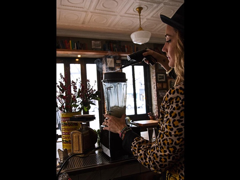 Laino's inspiration for her cocktails comes primarily from her vegetarian diet: Fresh juices and herbs translate well to mixology, as cocktails typically don't involve animal fats. Instead of drawing from a love of smoked meats, she originally began smoking cocktails by burning sage on a plate and allowing the herb to subtly flavor a rocks glass. Now she makes her intensely flavored cocktails by adding a spirit to a blender and filling it with hickory smoke. This way she can control the flavors more easily and bring out the woodiness or bitter flavors of certain spirits, such as reposado tequila.