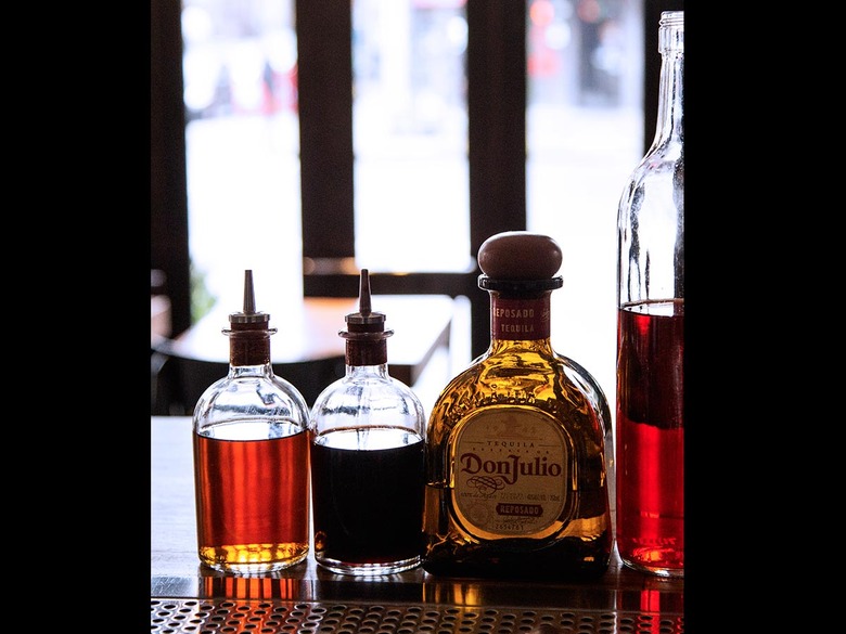 Laino is using the smoked tequila to create her namesake cocktail, Angela's Arch. To make it, stir together 1¼ ounces of the smoked reposado tequila (Angela recommends Don Julio reposado); ½ ounce of red wine reduction; ⅓ ounce of Italian aperitif, such as Aperol; and 2 dashes of orange bitters. Strain over ice and top with an orange rind and a snifter of smoke.