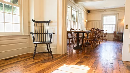 Nestled on a triangle of greens between the two main roads in Salisbury, Connecticut, The White Hart inn has been a town gathering space for the past 200 years. New owners, including Malcolm Gladwell and chef Annie Wayte, have revived the beloved rooms, like this stunning rustic dining room.