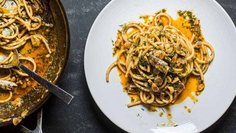"It's a classic regional Sardinian recipe called pasta con la sarde," Trabocchi says. "We're going to take the dish and recreate it with the tinned fish we have today. It's finished with fresh dill, and there's a hint of spice that actually comes from Spain, the Espelette pepper, a crunch and a buttery note with the toasted almonds."