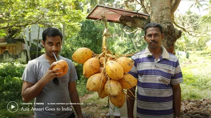 The video is more than just two enjoyable minutes of Ansari's likeable personality. It's a way to take a vicarious trip to India, as we enter the throes of Trivandrum, a South Indian city Ansari describes as "jungly and humid." He takes us into the middle of bustling Chalai Market, with its piles of fresh vegetables and people strolling by carrying metal tubs on their heads, and shares insider secrets on the glory of roadside coconuts.