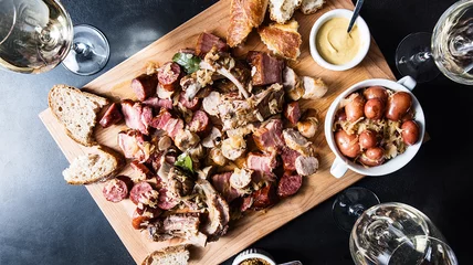 This dish is known for its blend of multiple types of pork. Fresh, cured and smoked varieties are cooked together for an extremely intense pork flavor. Every family's recipe differs, but typically two to three types of sausage, bacon and pork ribs are in the mix. "I like to have a couple of different sausages with the choucroute," Kreuther says. "One smoked, a regular knack sausage, a blood sausage and some liver dumplings with onion sauce. For the meat, I like to have two kinds of bacon, salted pork ribs and even a ham hock."