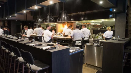 The idea is to erase the kitchen's and restaurant's barriers, so both of the kitchens—one on the ground floor, another in the basement—are open to guests, waiting for a bar-style meal prepared by Achatz or chef Andrew Brochu, who joined the team at the Aviary in 2013. "The restaurant was mostly formed around the personality of the executive chef Andrew Brochu," says Achatz. "His cooking is influenced by American South, French and Asian techniques."
