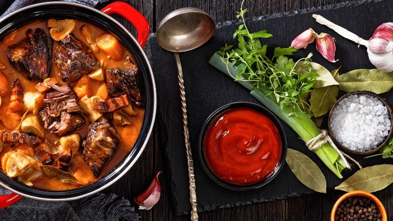 Combining a bouquet garni with other aromatics like mirepoix tastes incredible in dishes like red wine braised short ribs. A recipe like Anthony Bourdain's boeuf bourguignon, which uses aromatics like celery, garlic, and onion, also calls for several herbs and spices. Rather than fishing out the large pieces of herbs before serving, consider crafting a bouquet to cut down on effort when it is time to serve.