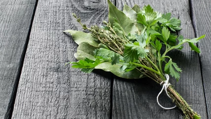 A bouquet garni, pronounced (boo-kay-Gahr-nee), means "garnished bouquet" and traditionally consists of a small bundle of fresh herbs, including parsley, thyme, and bay leaves. Classic combo aside, you have free reign in your kitchen, so feel free to use other herbs or aromatics. Remember, when you craft your little bundle, parsley is a non-exchangeable herb, and you should always add it. Considering parsley's clean and earthy flavor, it beautifully enhances all sorts of dishes.