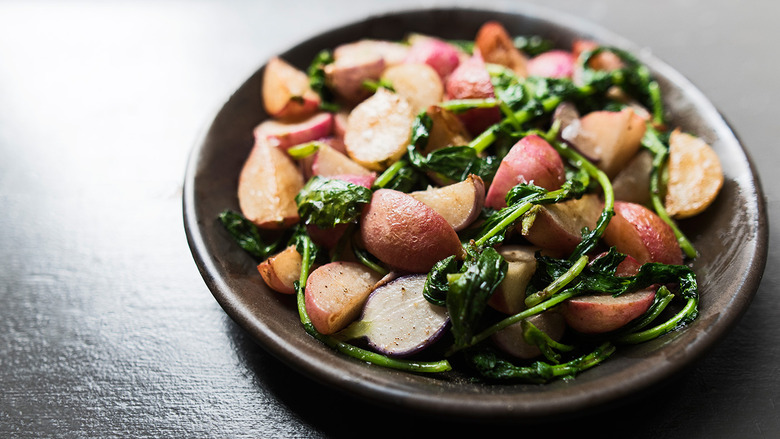 When they're cooked, radishes get tender and their bite mellows out. Not wanting to waste anything, we throw the radish greens into the pan, too, and everything gets coated in silky melted butter. At the end, we sprinkle it all with flaky salt. They're delicious on their own, but these cooked radishes would be just as at home on toast as their raw comrades.