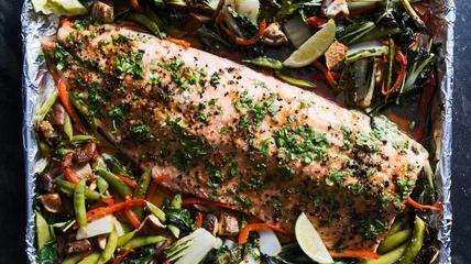 Whirl together a simple soy-honey-sesame dressing and drizzle it all over a fillet of salmon and beautiful tangle of brightly colored vegetables. The impressive-looking pan goes into the oven for just 30 short minutes.