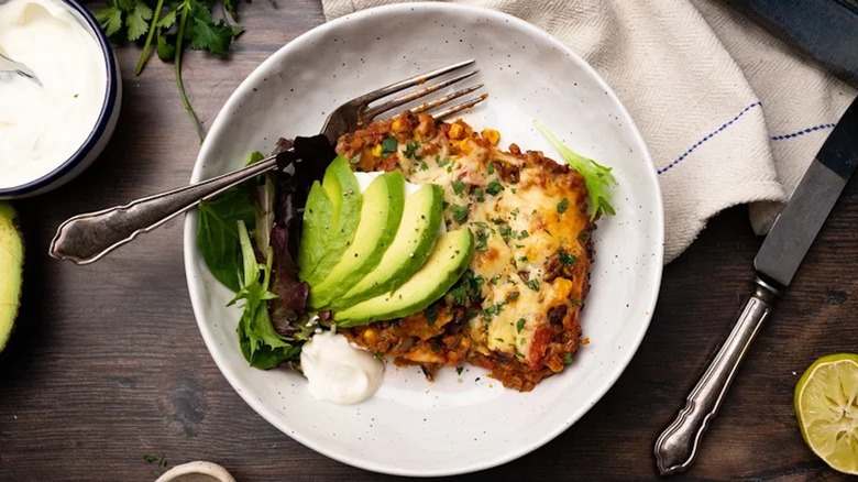 Tortilla strips create a textural base and refried beans and seasoned beef simmered with tomatoes, black beans, and sweet corn are layered on top. Finished with a hefty helping of shredded cheddar cheese, this Mexican casserole looks delicious and tastes even better.