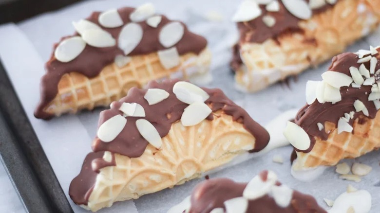 Taco lovers know that the folded tortilla treat doesn't always have to be savory. These Choco Taco dupes are made with sweet waffle batter pressed into a pizzelle iron to create a delicate cookie that's folded into a taco shape. These shells are filled with vanilla ice cream with a drizzle of caramel sauce, and then sealed with melted chocolate. Sprinkle sliced almonds on each dessert taco for added flavor and texture before setting them in the freezer.