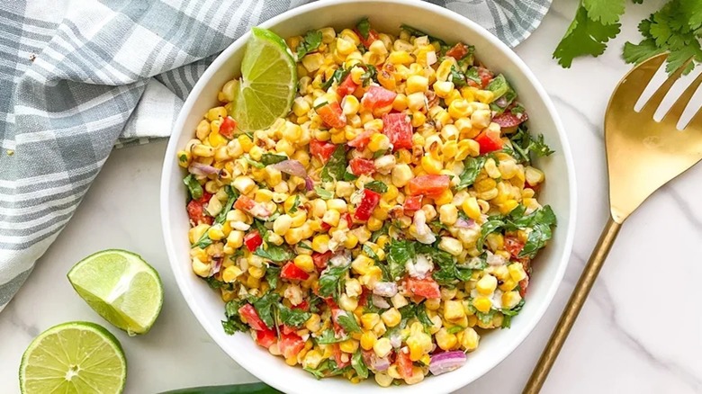 When you love the taste of elote but want to pass on the mess of chowing down on whole corn on the cob, enjoy all the same flavors in this easy-to-eat salad instead. The tender corn is given a quick char on the grill to bring out its natural sweetness. The kernels are then cut off of the cob and mixed with diced jalapeño, red pepper, onion, cilantro, cotija cheese, and a homemade zesty and creamy sauce with a hint of Tajín.