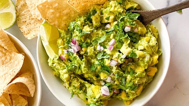 The refreshing tropical sweetness of mango plays nicely with creamy avocado in this fresh mango guacamole, creating a decadent dip that complements many dishes you're likely to serve at your party.