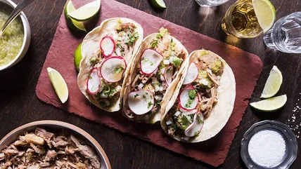 Fill corn tortillas with the pork and top them with salsa, cilantro, radish slices, diced onion, and a squeeze of lime juice to enjoy these tasty tacos.