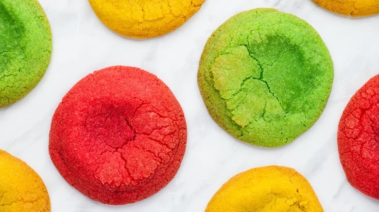 Celebrate the vibrant colors of Mexico by serving these simple sugar cookies as a Cinco de Mayo treat. Cookies in hues of bright red, yellow, and green look festive on the dessert table and feature an approachable vanilla flavor that appeals to most palates. After coloring and forming the cookies, they're rolled in granulated sugar and baked, resulting in buttery bites with a subtly sweet crunch.