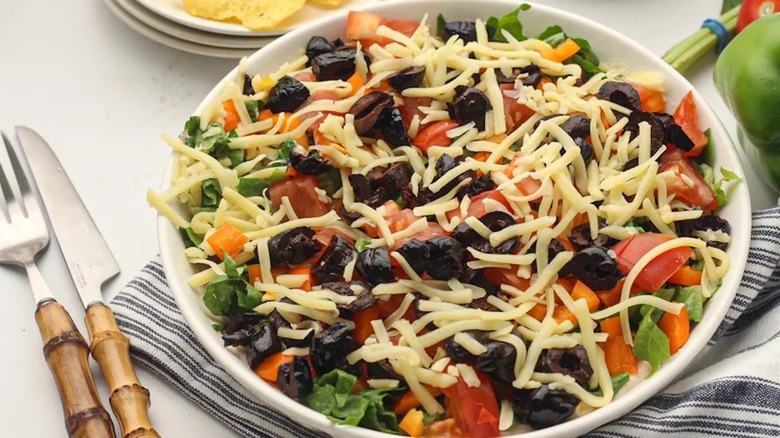 This tasty dip with all the familiar flavors you crave makes for an easy dish to bring to a Cinco de Mayo party when you've been assigned appetizer duty. Tangy tomatoes, chopped romaine lettuce, and bell pepper meet rich black olives and unctuous shredded cheese before being tossed in a spicy sour cream sauce that offers a taste of taco on every tortilla chip.