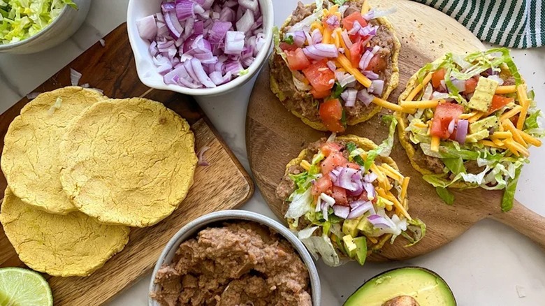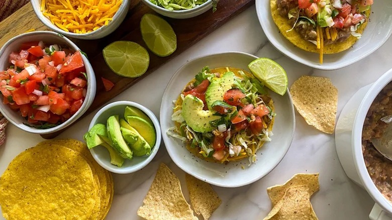 The complementary textures and versatility of this dish make it a real crowd-pleaser at any Cinco de Mayo fiesta. Mashed pinto beans bring velvety earthiness to crunchy tostada shells that get topped with avocado, cheese, shredded lettuce, and fresh pico de gallo, according to each diner's preference.