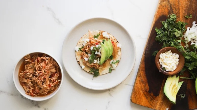The slow and low cooking time allows you to make this dish ahead of time or mingle with guests before shredding the chicken and serving it in a taco, on a tostada, or stuffed into a burrito for Cinco de Mayo.