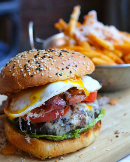 The addition of fried eggs make burgers an acceptable breakfast.
