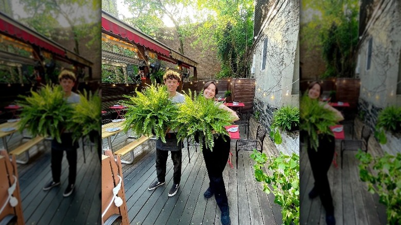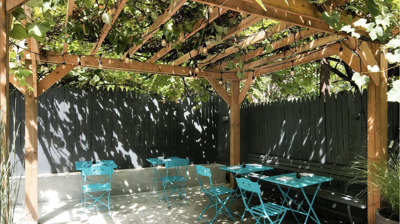 Pass through the main dining room to the backyard, where you'll find a wooden-walled fern palace. This backyard feels spacious yet cozy, partly thanks to the awnings that are set up in the middle of the space and can extend to cover the entire area in shade.