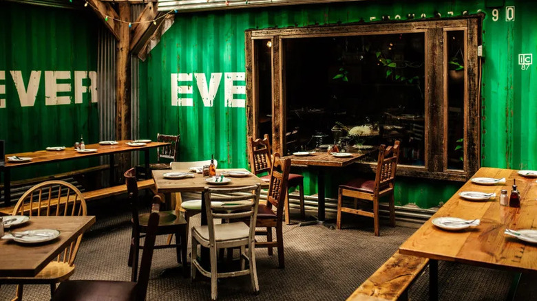 The shed that this restaurant has constructed to house its outdoor dining has a history. Look closely at the wood used to create the block-shaped tables and chairs: All the materials used for this outdoor dining were actually repurposed from plywood used to board up windows during protests at the beginning of the lockdown, which explains the inconsistent paint job.