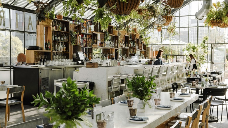 If you want to dine outdoors, but the weather is showing a possibility of wind or rain, Openaire in Koreatown is a great way to enjoy an outdoor view while being sheltered in the beautiful greenhouse section of the patio. The hanging plants, wooden accents, and white and light-colored furniture emphasize the open, airy nature of the space (hence the name, Openaire). You can also dine on the fully outdoor patio.