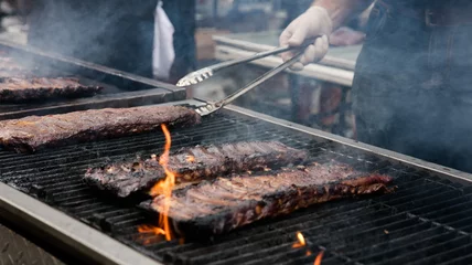 Rack of ribs finishing up on the grill before getting cut and served to hungry patrons.