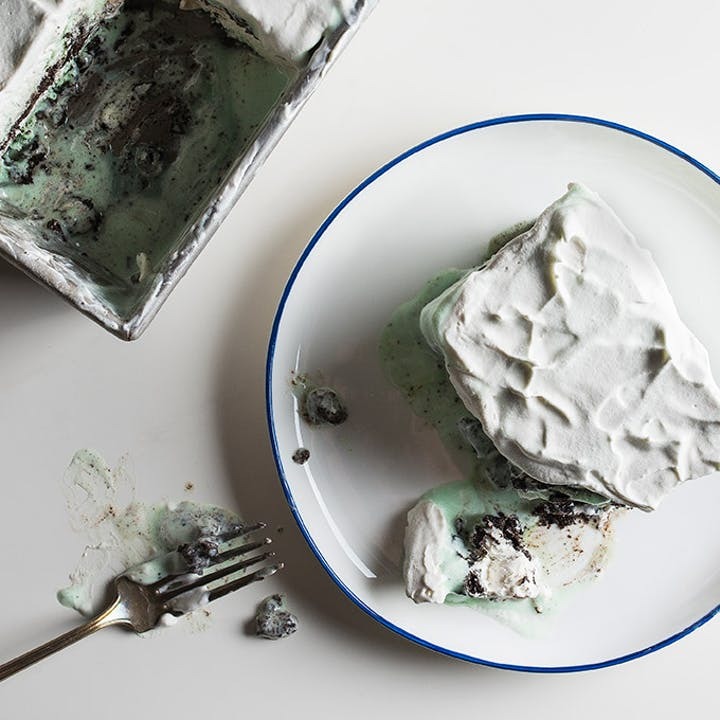 Finally, we give you license to get creative with this ice cream cake. Layer cookies, ice cream and whipped topping, then repeat. We go with mint chocolate chip and Oreos here, but the possibilities are endless.