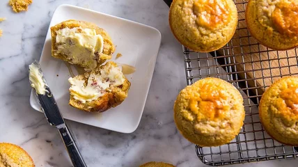 Out of the oven, golden and hot, the muffins hide jammy pockets of strawberries surrounded by a soft cornmeal crumb. Swipe with butter, drizzle with honey and finish with a pinch of flaky salt for your new favorite start to the day.