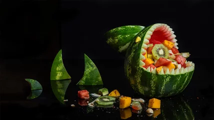 ④ A shark-shaped watermelon is your go-to centerpiece for a viewing party. It doesn't hurt that what's inside—salty, spicy fruit salad—will also make your guests', er, jaws drop.