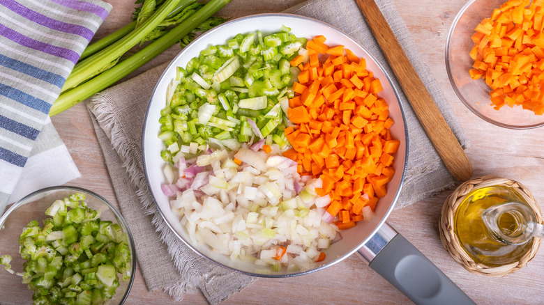 If you're preparing to cook Italian-leaning cuisine all week at home, you might want to make a big batch of soffritto at the beginning of the week. You can then save time by having it on hand to dip into each time the dinner hour rolls around. Alongside the vegetables you'll need, make sure to have plenty of good olive oil on hand for frying and any additional aromatics you might want to add, depending on what recipes you plan to make.