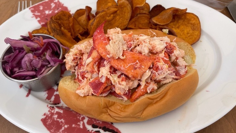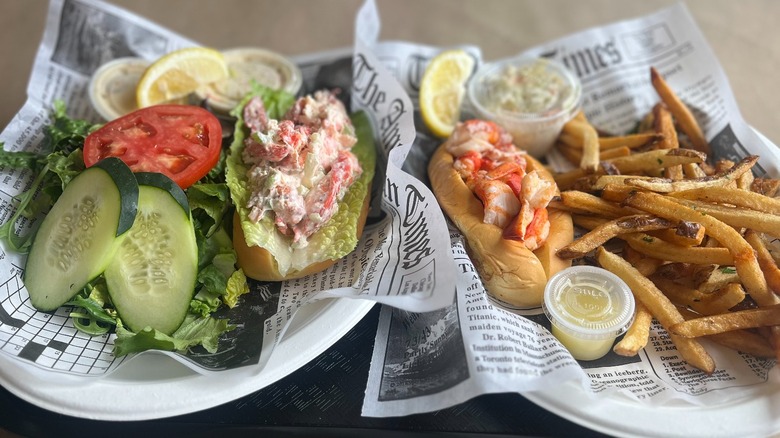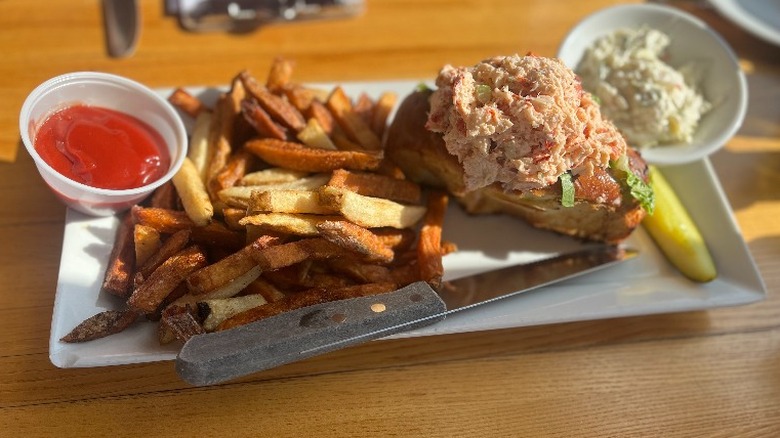 On offer at the Inlet is Larry's Lobster Roll, billed as "lobster salad on buttered brioche," which is listed at market price and was $38 on the day we visited. Nestled within a toasted roll of buttered brioche are chunks of diced red onion, chopped celery, a bed of shredded lettuce, lots of mayo, and a hearty quantity of celery seed. The cold lobster meat is a combination of small pieces of whole lobster and a larger portion of shredded lobster meat slathered in heavily seasoned mayo. The Inlet's lobster roll could benefit from a little less seasoning and a little more whole lobster, but the brioche is rich and buttery, and the plate comes with fresh coleslaw and piping hot french fries.