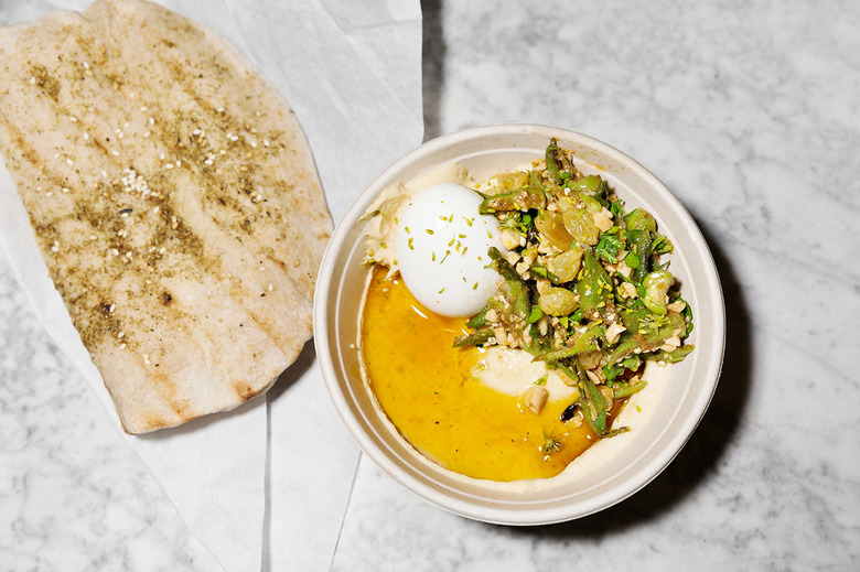 Madcapra's hummus offerings include this number topped with okra, raisins and a soft-boiled egg.