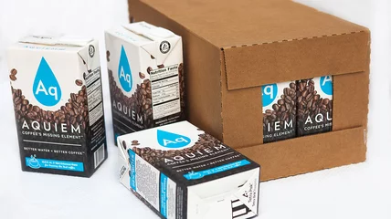 Aquiem cofounder Rob Vidacovich tells Daily Coffee News, "You could probably refer to it as 'distilled' because at that point in time, we've pulled out just about everything, and then we add back a blend of essential minerals that specifically enhance the flavor, the aroma and the consistency of the coffee."