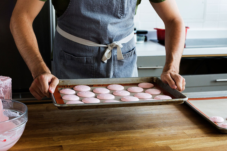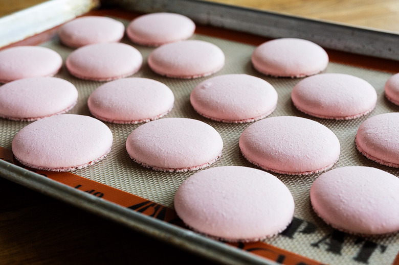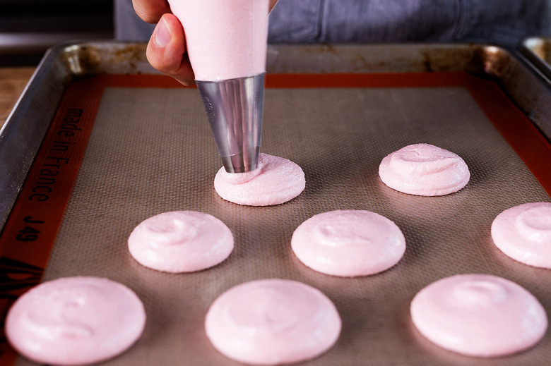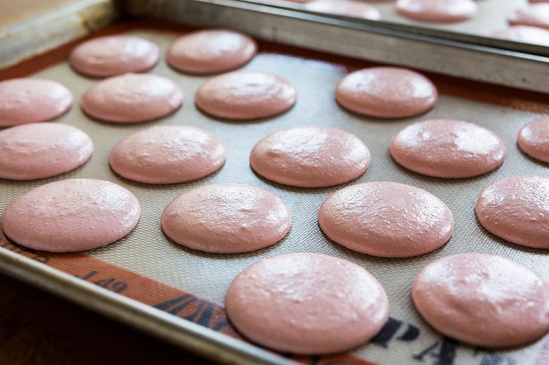 The most important part of piping? Slamming the tray. That's right, banging the baking sheet on a sturdy flat surface spreads the loose batter slightly and smoothes the tops, leaving you with a matte, eggshell appearance and those perfect feet.