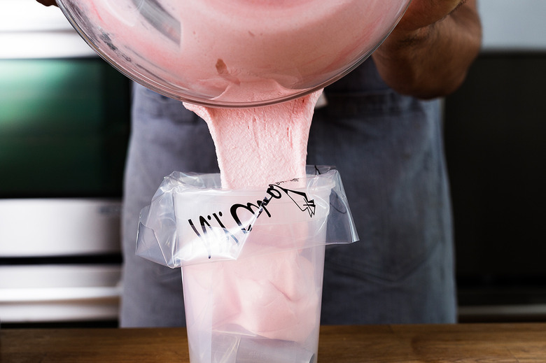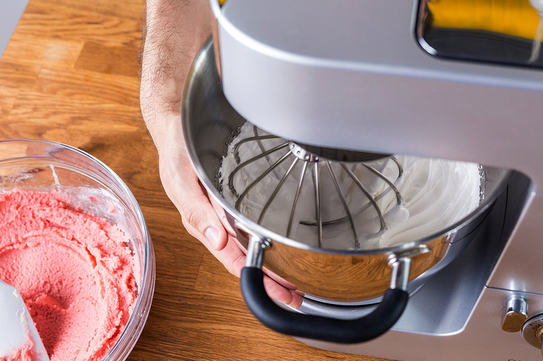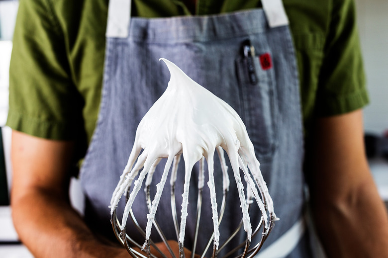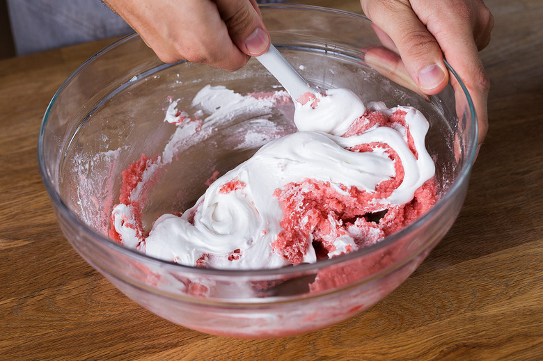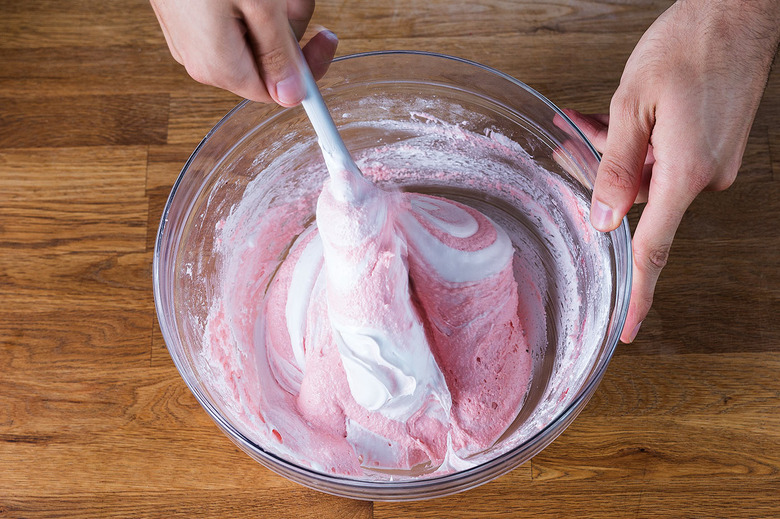 Once you've decided on a meringue, be gentle when folding it into the batter. "You want to be sure to add small amounts of meringue into the almond paste to gently lighten the batter," Altieri instructs. "You should be able to pick some up with your spatula, and it should slowly fall off."