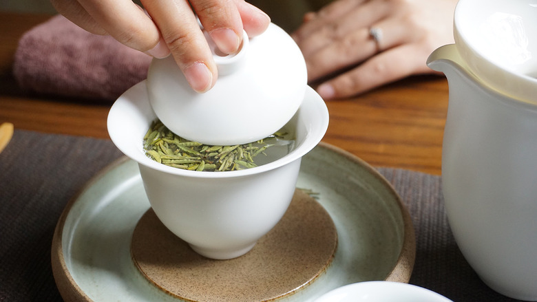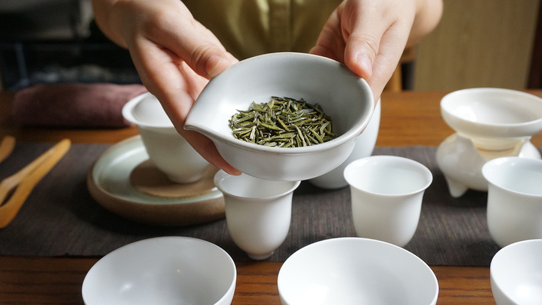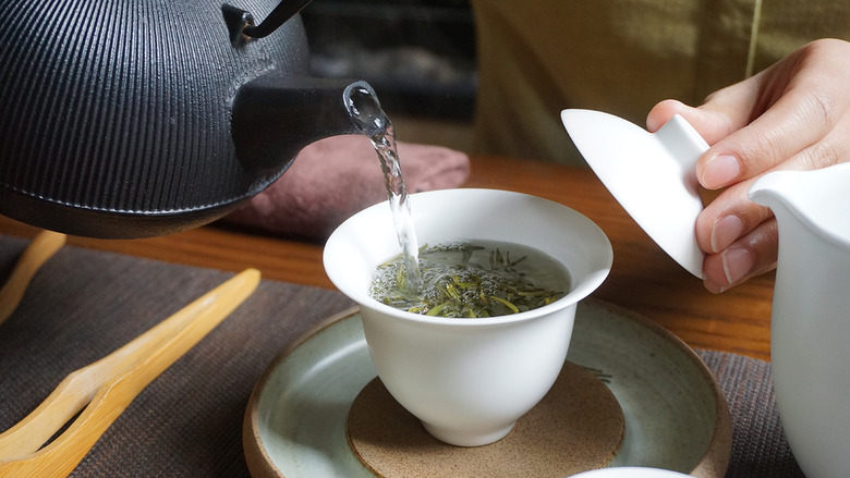 The most important part when brewing a tea like this is to properly prime your drinking vessel with hot water to ensure the liquid gets to the right temperature. Here, the green tea is submerged in 195-degree water for only 10 seconds before being strained and poured into a primed teacup.