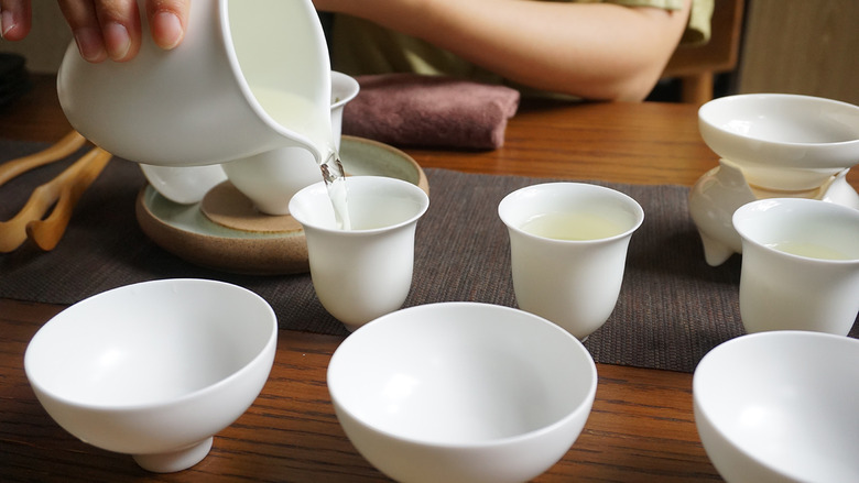 A ceramic cup is used to remove any bubbles from the surface of the tea.