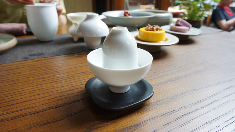 Larger teacups are placed over the small ones and inverted to transfer the tea cleanly. You then present the empty teacup to smell the aroma can be enjoyed.