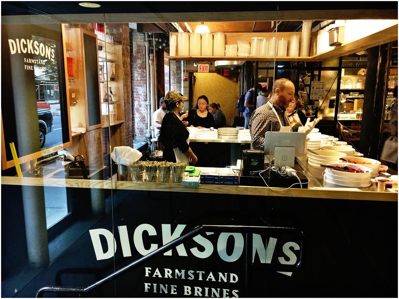 Inspired by those trips, Dickson, who also owns the popular butcher shop, Dickson's Farmstand Meats, opened his own pickle shop, Dickson's Fine Brines, in Chelsea Market this week. Fittingly, there are full sours on the menu of options made by Nick and Ron Horman, who Dickson says are "third-generation pickle men. Their family has been making cucumber pickles continuously for 108 years."