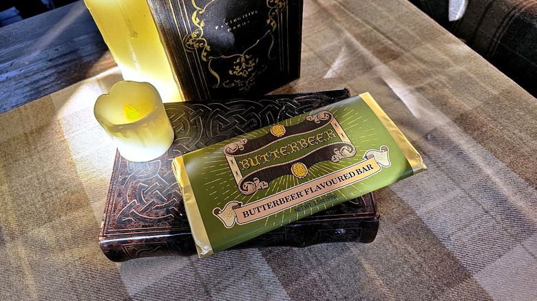 Chocolate bars are that easy treat you can grab from any convenience store and enjoy anywhere whenever the mood hits. Since they're such an easy treat, it makes perfect sense that The Wizarding World of Harry Potter would create its own version with a Butterbeer Chocolate Bar. Reminiscent of something you'd find in Willy Wonka's chocolate shop, this bar is not your typical 2-ounce Hershey's bar. Instead, this is nice-sized 3.5-ounce bar that's wrapped in gold.