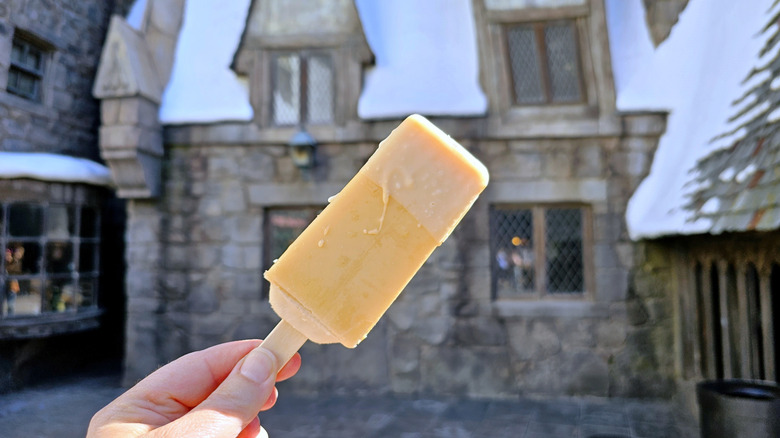It's been years since I've had an Edy's Pie, but I was always a fan. That hard, dark chocolate shell surrounding a sweet and creamy bar of vanilla ice cream — it was the ultimate treat on a hot summer day. Thanks to the new Butterbeer Ice Lolly inside The Wizarding World of Harry Potter, I got to relive my childhood dreams all over again, only better. Instead of a dark chocolate shell, I got a two-tone, white-and-golden, candy-coated shell that tastes like salted white chocolate and surrounds a bar of Frozen Butterbeer.
