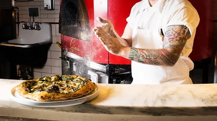 "It's one of the hardest things you have to do as a cook," Telo says of the art of pizza slinging. "It's challenging, but it's also fun." The kind of dough Telo is making requires multiple phases of proofing and portioning before it even gets rolled out. And then there's having the right oven, which is crucial. Luckily, 21 Greenpoint already had a wood-burning oven perfect for baking Telo's light and fluffy pies, like the mushroom pie with pesto sauce and a garlic-butter crust (see the recipe).