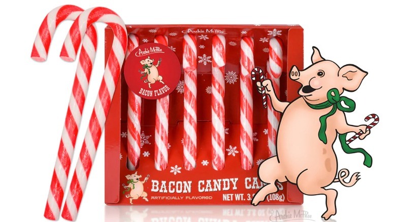 After pickle, this flavor came up most often in searches for non-traditional candy cane flavors. And why wouldn't it? Bacon still reigns supreme with American consumers, so much so that an entire industry has sprung up around the ubiquitous foodstuff to cater to people who just can't get enough of the salty, smoky delight (via TIME). Obviously, candy canes had to get in on the success of the most beloved pork product too. The bacon canes come in a traditional red and white stripe, a clever coloring choice that certainly suggests to us the possibility of playing some pretty hilarious candy pranks with unsuspecting loved ones. That is, until they unwrap one of these babies and get a whiff of sweet, sweet bacon.