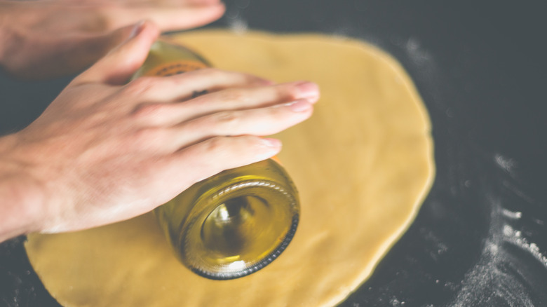 In fact, a wine bottle might actually work even better than a rolling pin since the glass will stay cooler for longer. A cool bottle will avoid heating up the dough and make the rolling process easier. Its neck also essentially functions as a ready-made handle, and the bottle's smooth surface will ensure your dough is even all around.
